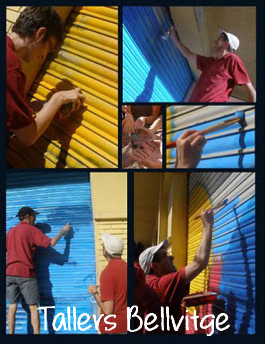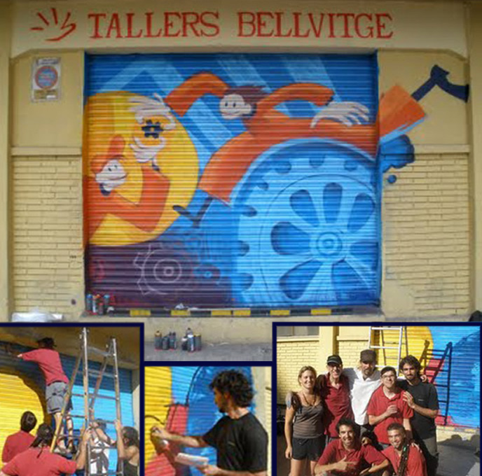 Taller de Graffiti en Persiana de “Tallers”: trabajo asalariado, asistencia y pedagogía a adultos con discapacidad psíquica,Bellvitge, 2009.